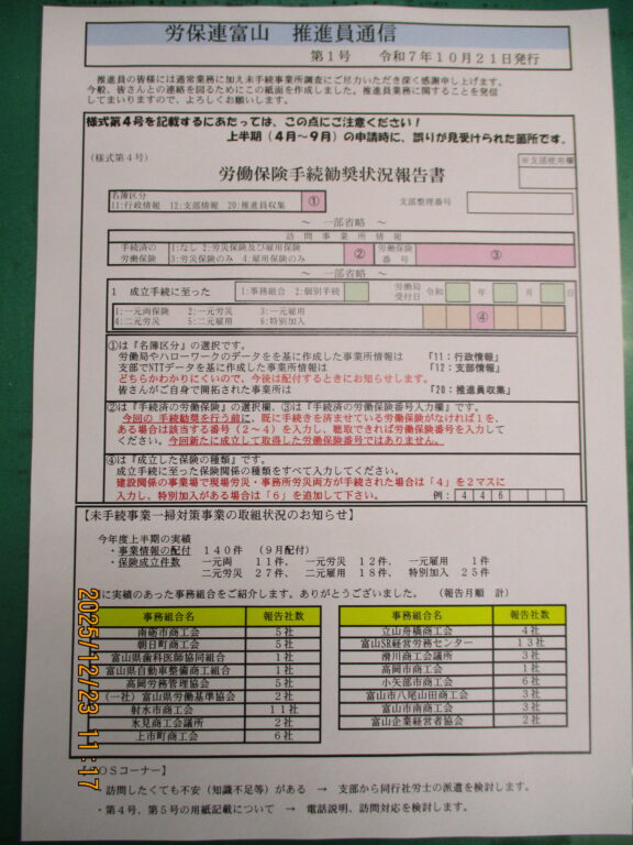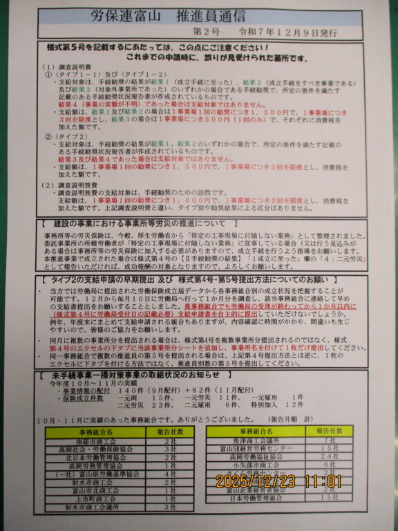 労働保険未手続事業一掃推進員の皆さんとの連絡を密にする目的で、今年度から「推進員通信」を発行しました。申請書内で推進員さんの間違いやすい箇所の説明やその時々の連絡事項、他事務組合の取組み状況などを掲載しています。第1号(令和7年10月21日発行)には様式第4号の記載上の注意点を、第2号(12月9日発行)には様式第5号の記載上の注意点を掲載いたしました。第3号は2月に発行予定としております。